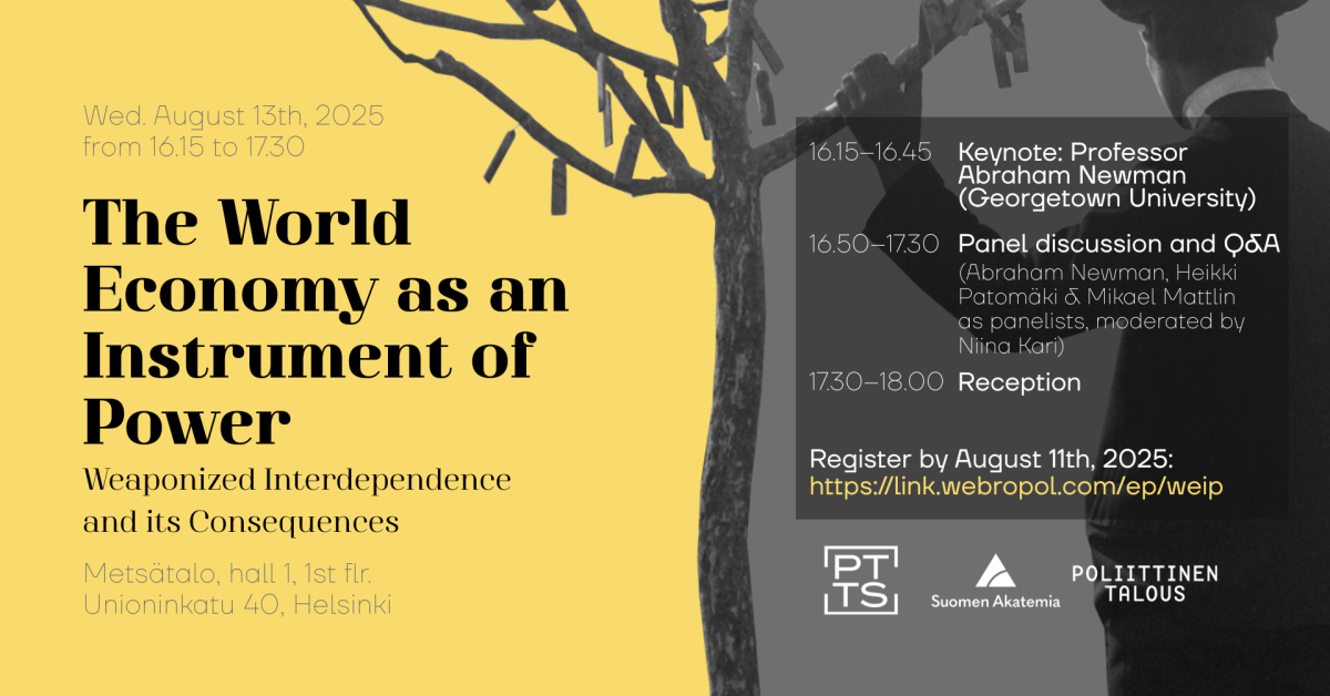 Poliittisen talouden tutkimuksen seuran, Poliittinen talous -lehden sekä Suomen Akatemian rahoittaman ”How to overcome tendencies toward trade wars?” -tutkimushankkeen 13.8. järjestämä tilaisuus pureutuu näihin kysymyksiin. Tilaisuudessa aihepiiristä alustaa globaalin poliittisen talouden johtaviin kansainvälisiin asiantuntijoihin lukeutuva, palkitun Underground Empire -teoksen kirjoittaja, professori Abraham Newman (Georgetownin yliopisto). Hänen puheenvuoroaan seuraa paneelikeskustelu, jossa Newmanin kanssa keskustelevat Helsingin yliopiston maailmanpolitiikan professori Heikki Patomäki ja Ulkopoliittisen instituutin tutkimusprofessori Mikael Mattlin. Paneelin juontaa väitöskirjatutkija Niina Kari (Helsingin yliopisto).