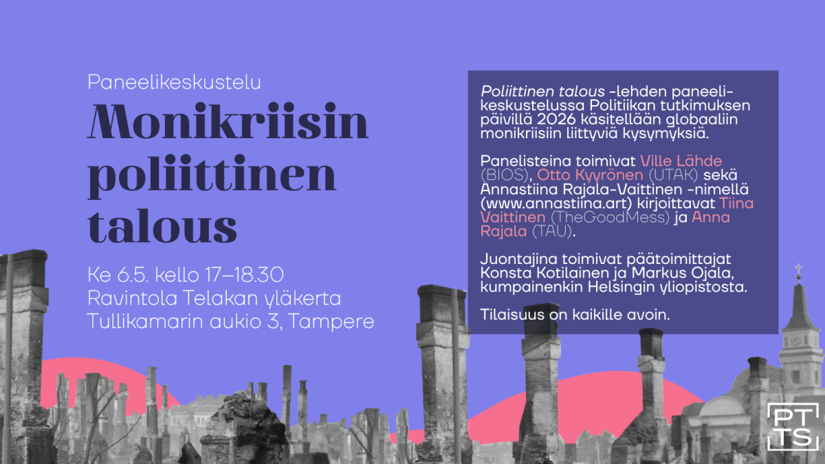 Poliittinen talous -lehti järjestää paneelikeskustelun globaalista monikriisistä keskiviikkona 6.5. kello 17–18.30. Paneeli pidetään Ravintola Telakan yläkerrassa (Tullikamarin aukio 3, Tampere). Tilaisuus on avoin kaikille.